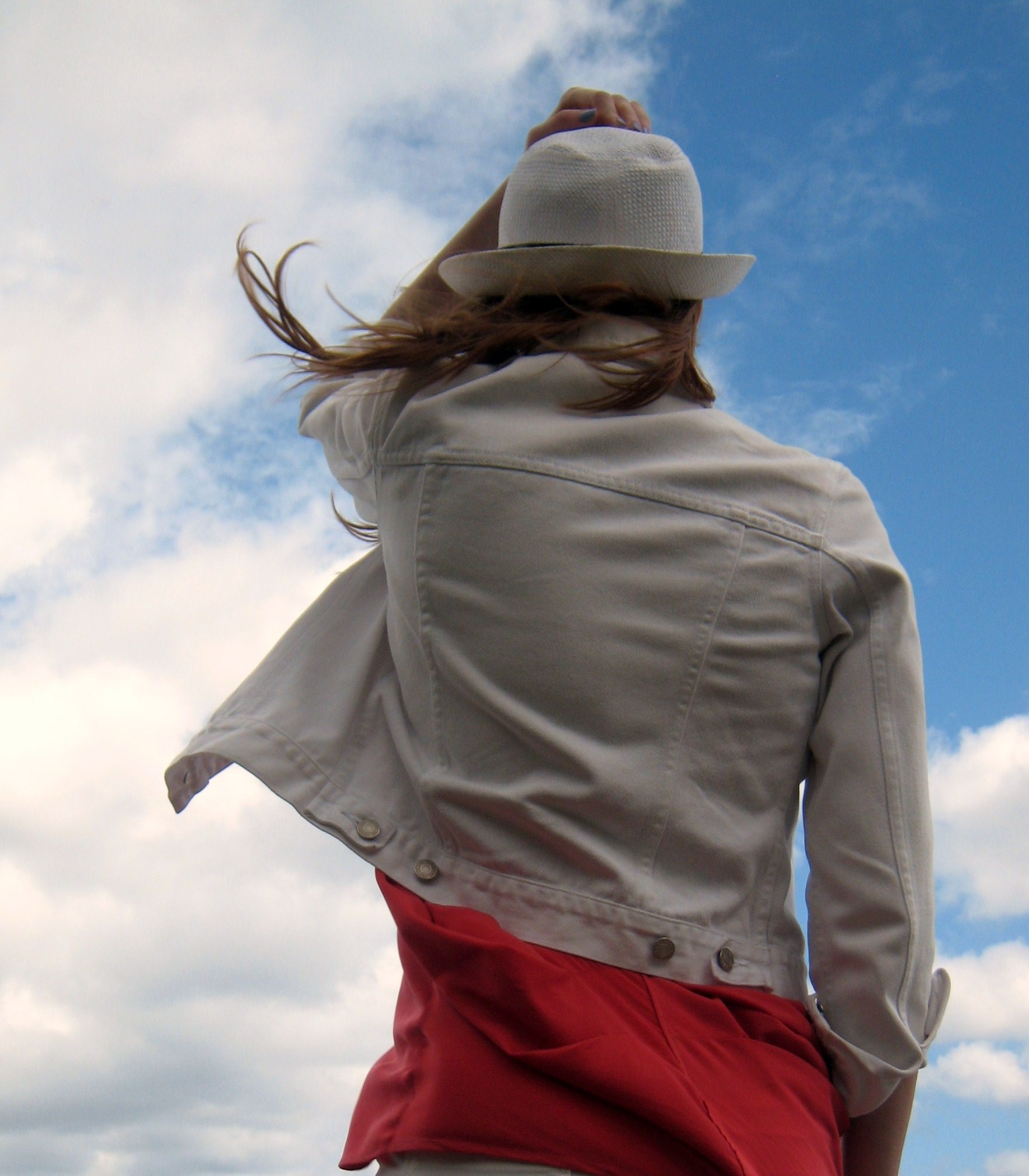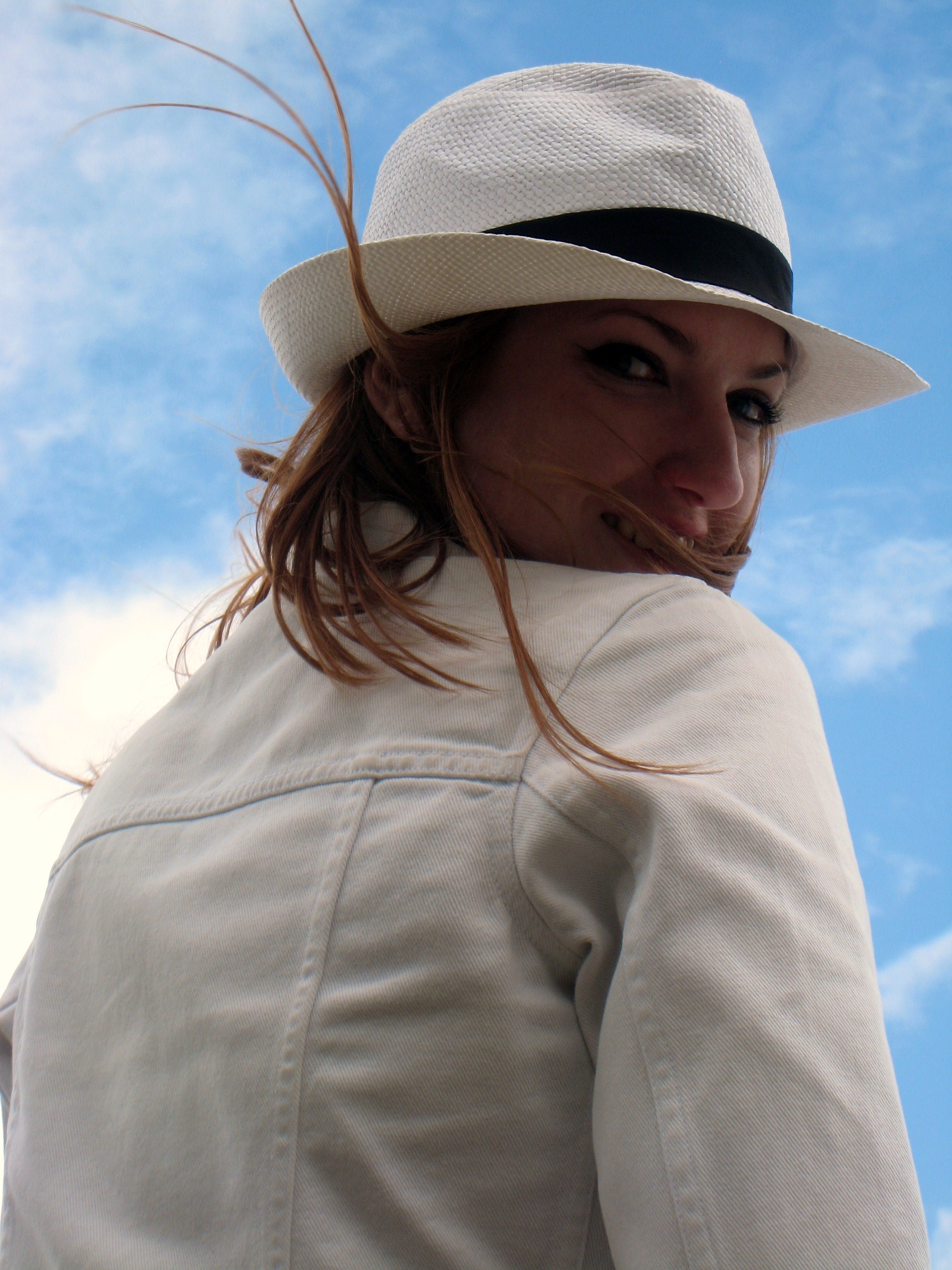 Cappello/Hat Panama style, Giacchino di jeans bianco/White jeans jacket, Maglia comprata a NYC/Shirt from NYC, Pantaloni/Pants Bershka, Scarpe/Shoes Primadonna, Zaino/Sac LV vintage, Occhiali/Sunglasses Alviero Martini