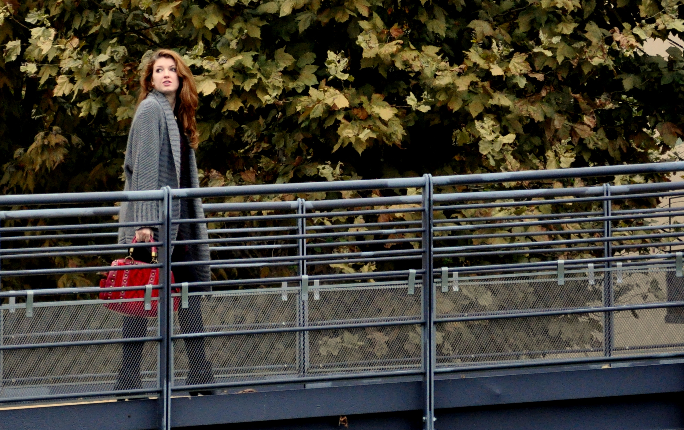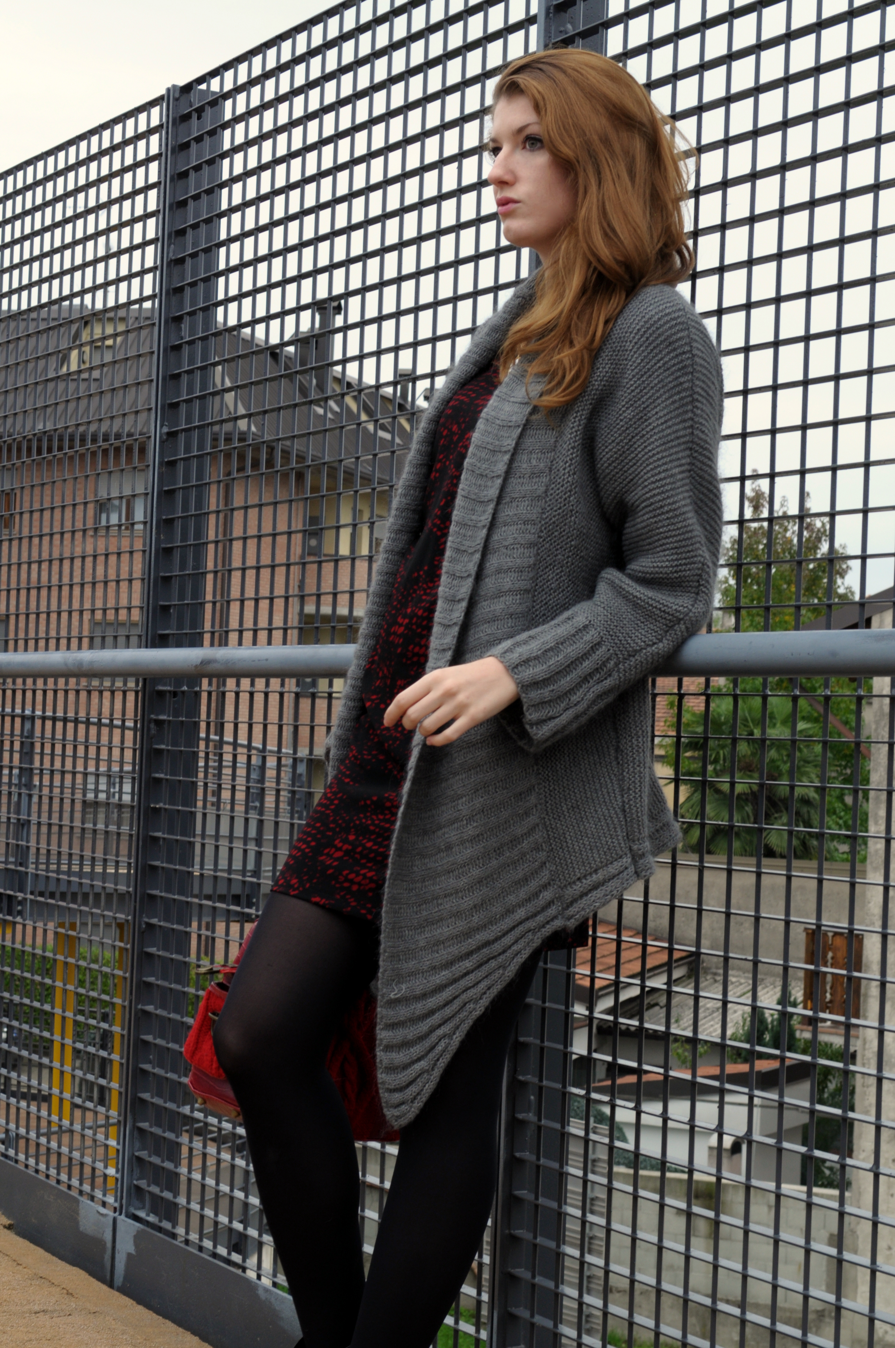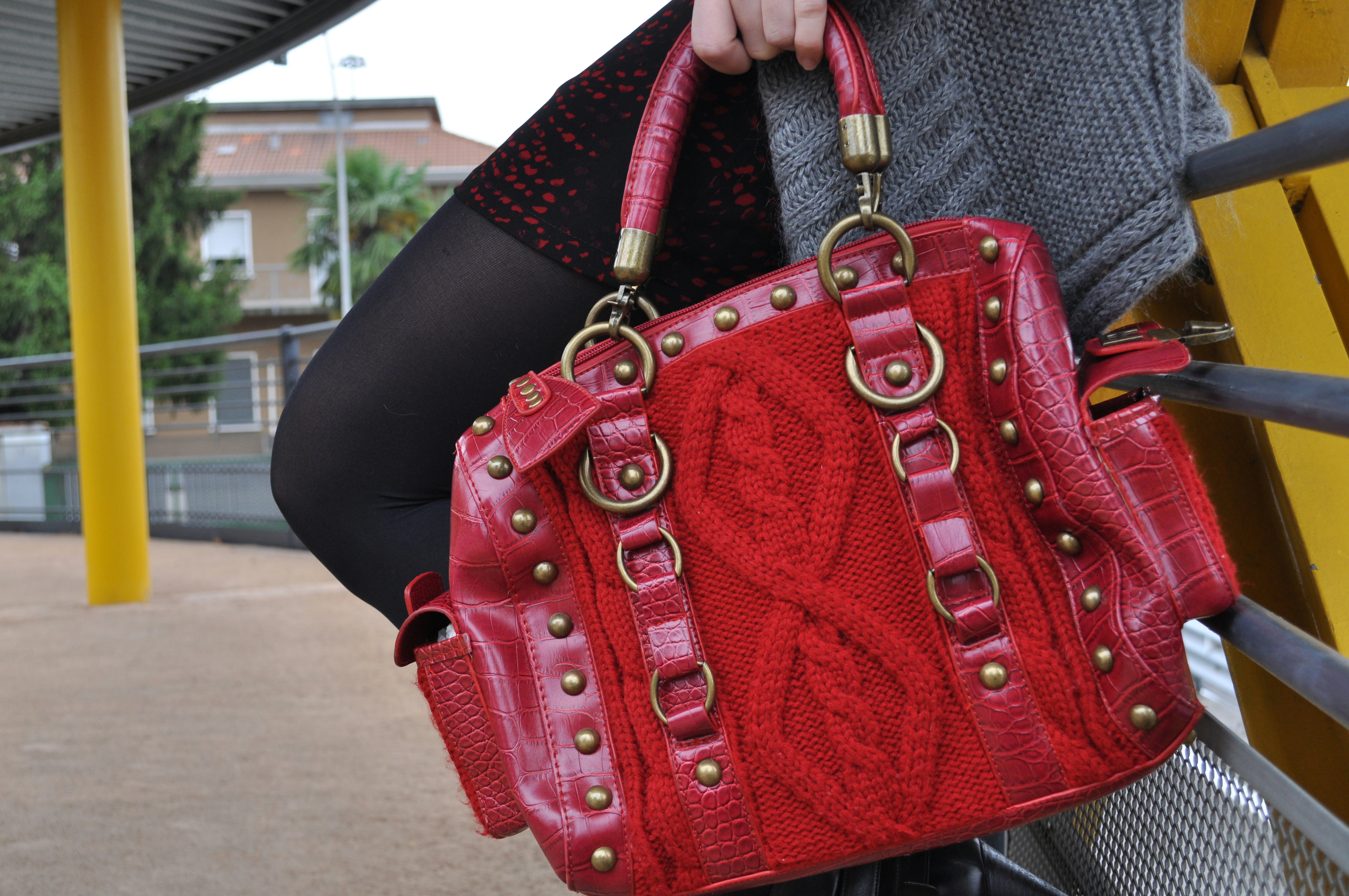 Sfondo urbano e un look che gioca con i contrasti tra forme e colori.
