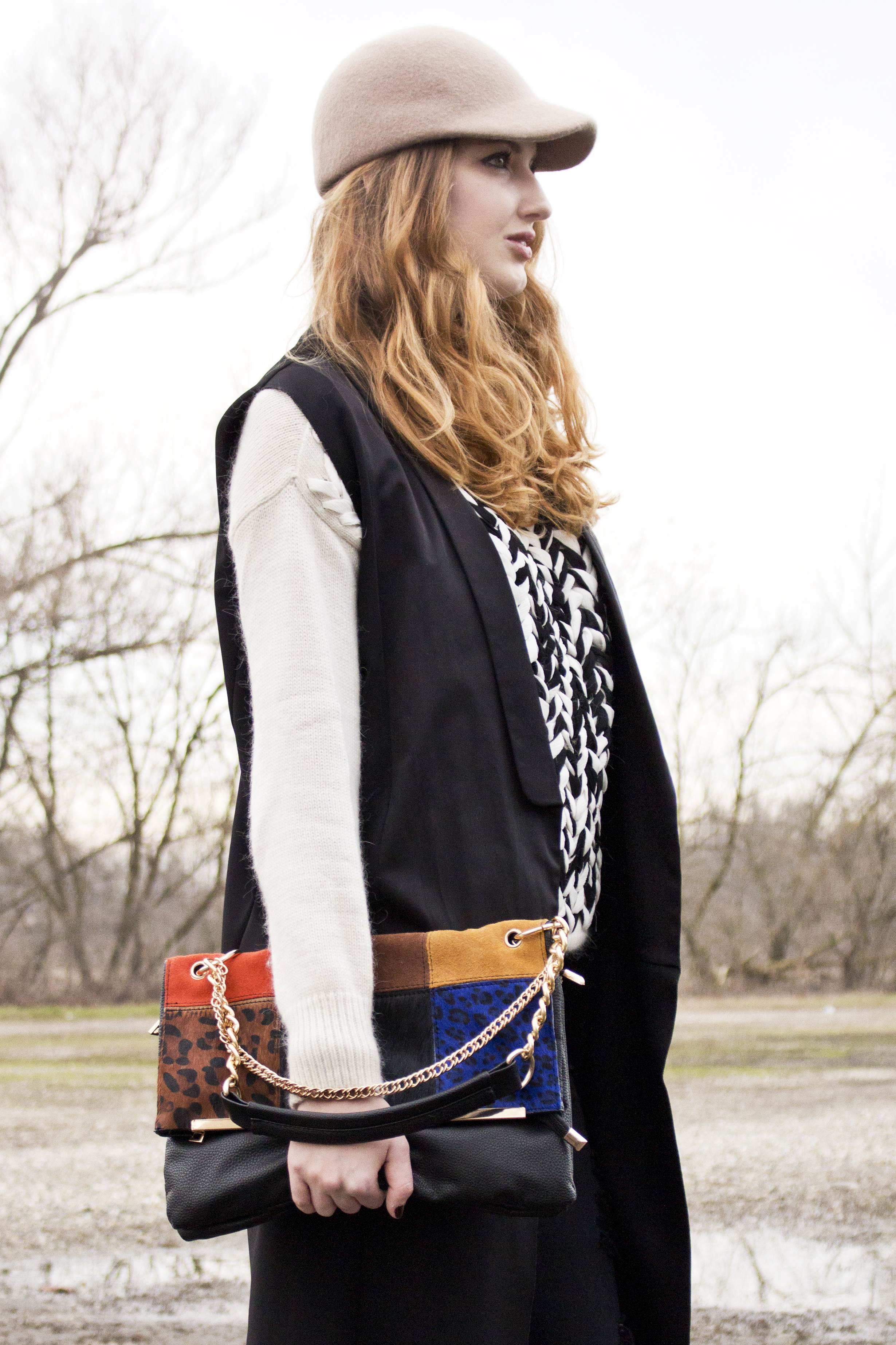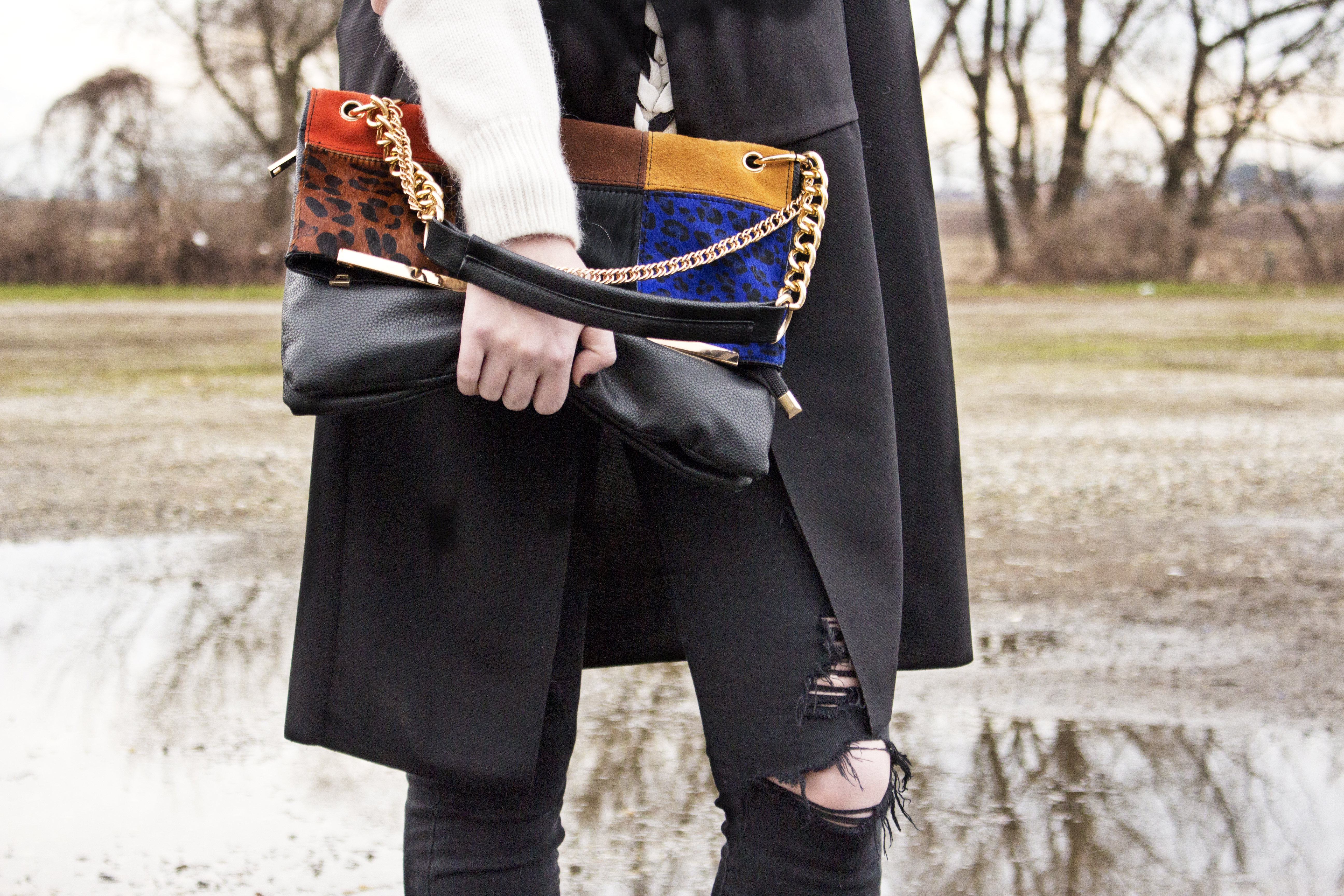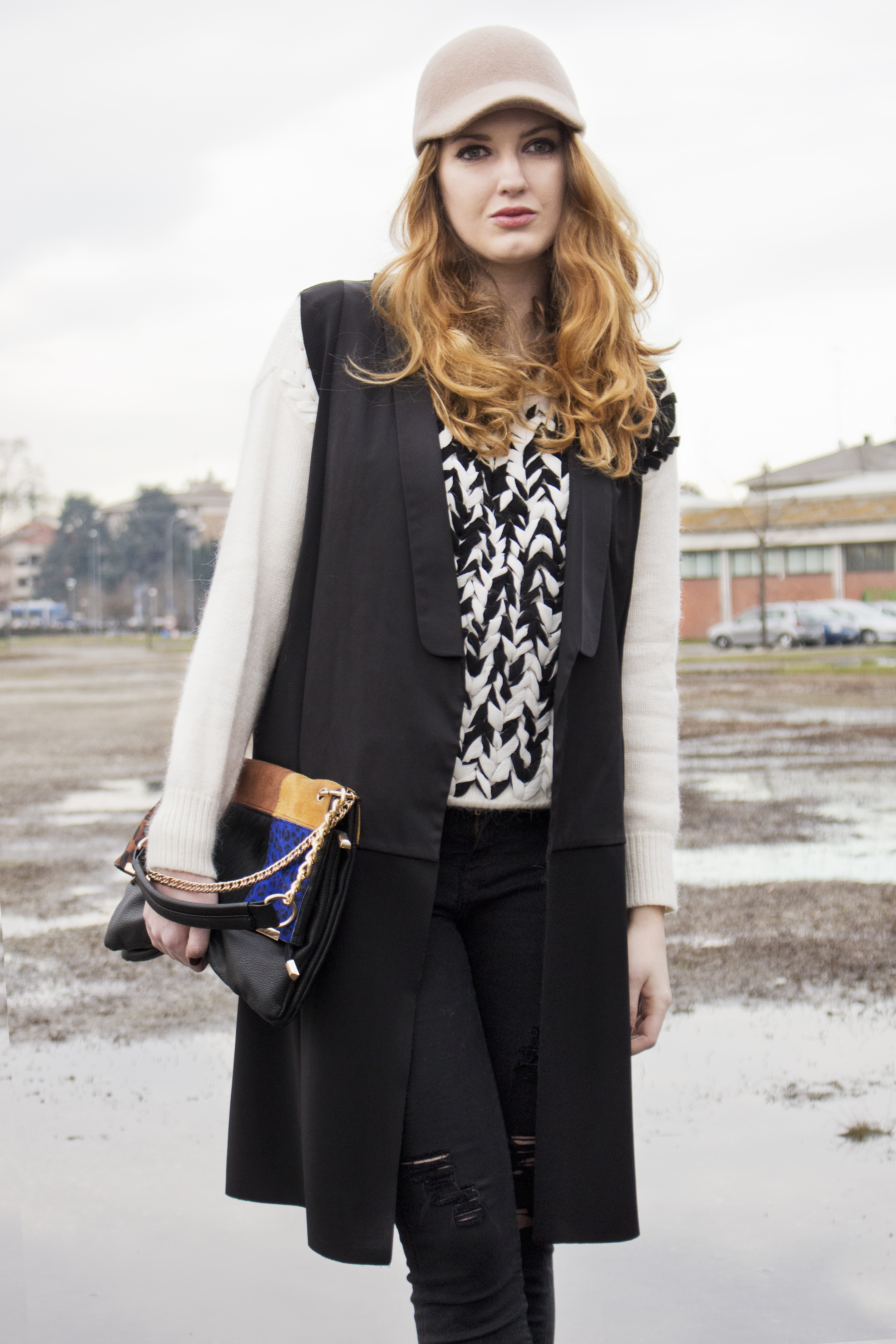 Ma bisogna comunque fare attenzione all’abbinamento. In questo caso ho optato per un bel paio di skinny neri strappati, che si possono trovare ovunque, un bel maglione caldo con un intreccio caratteristico e il mio gilet preferito.