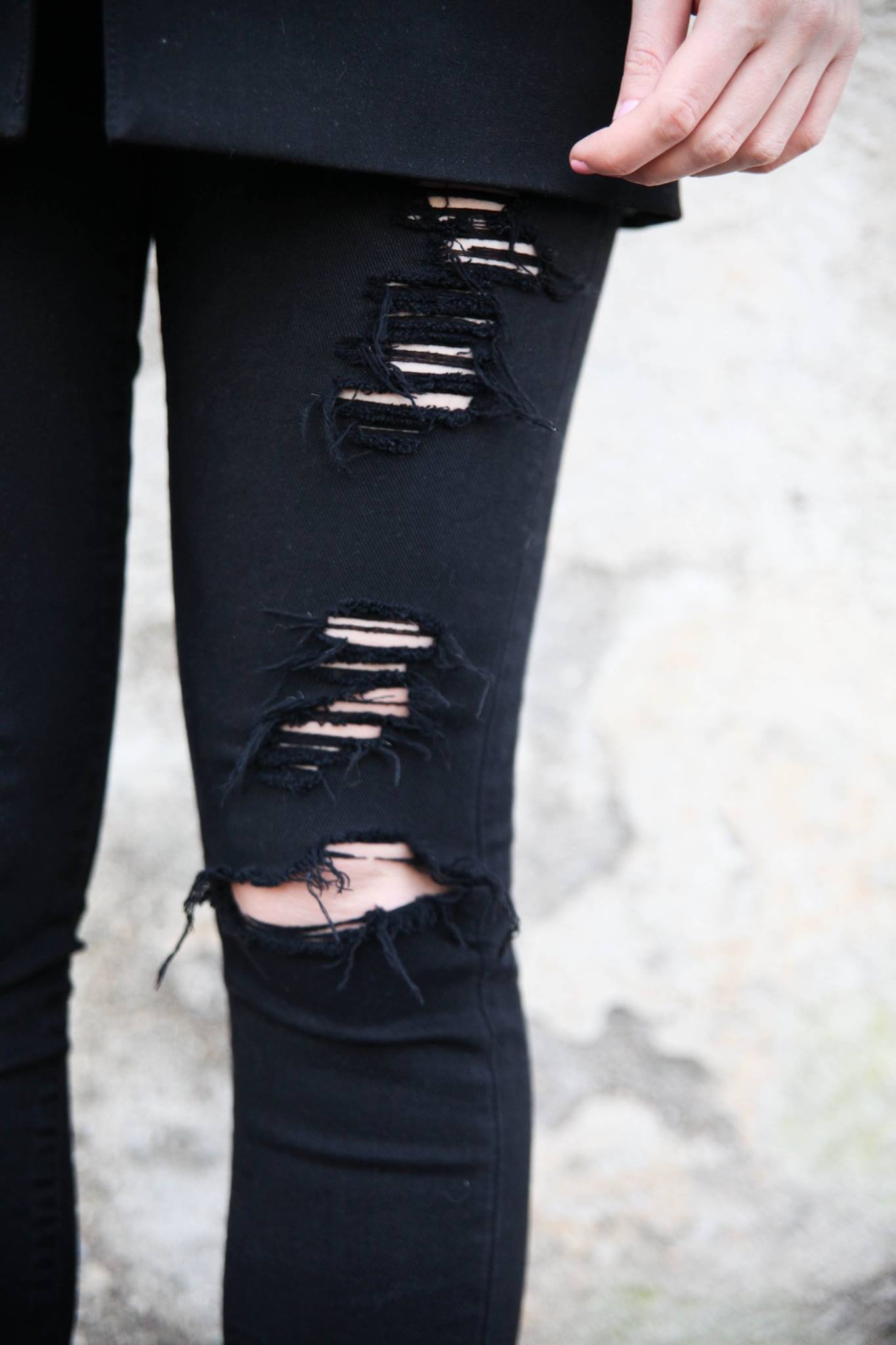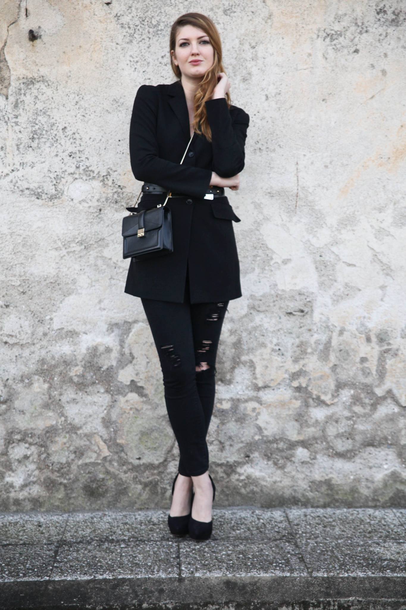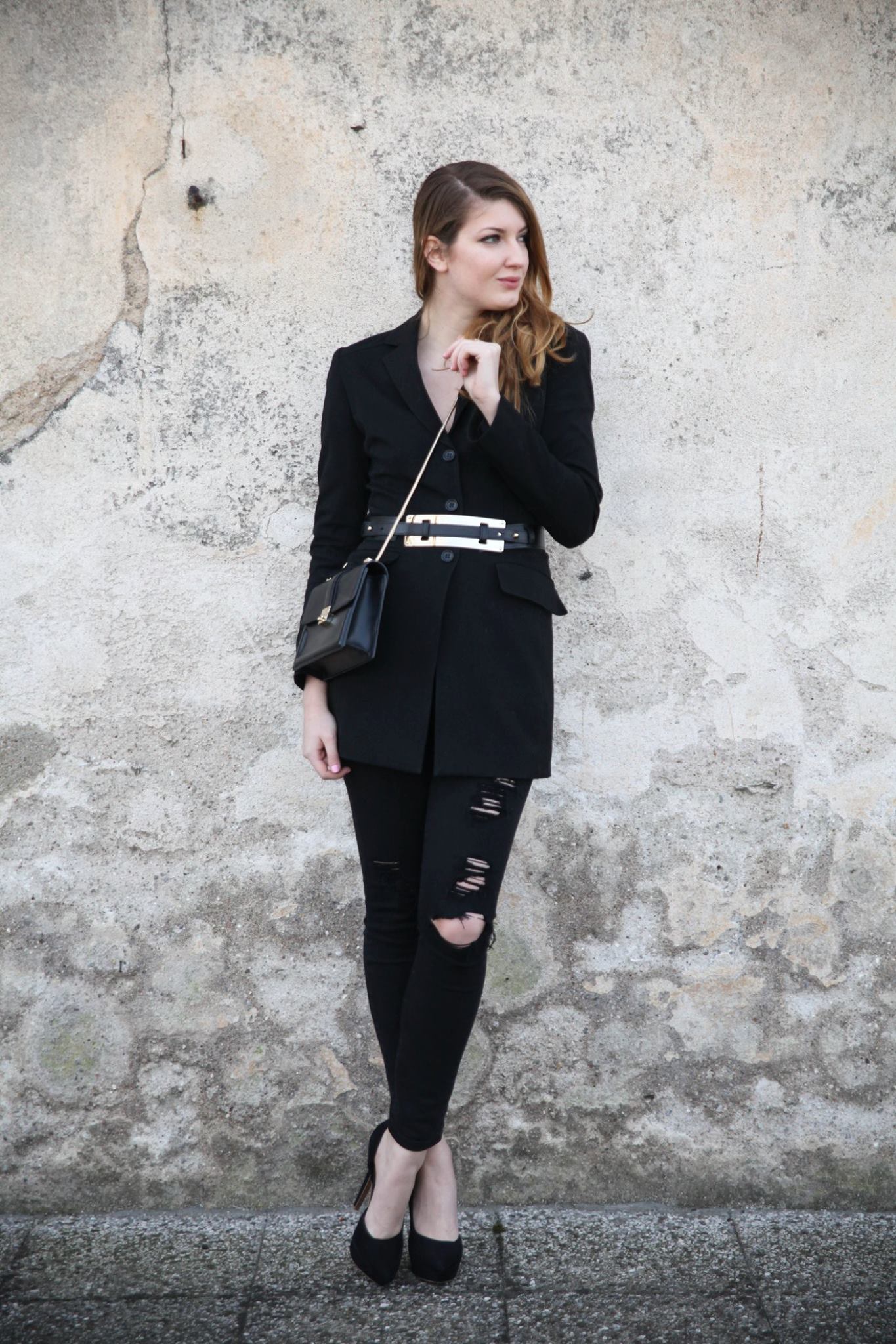 Gli elementi in metallo danno luce e gli strappi sui pantaloni rendono il tutto più attuale.