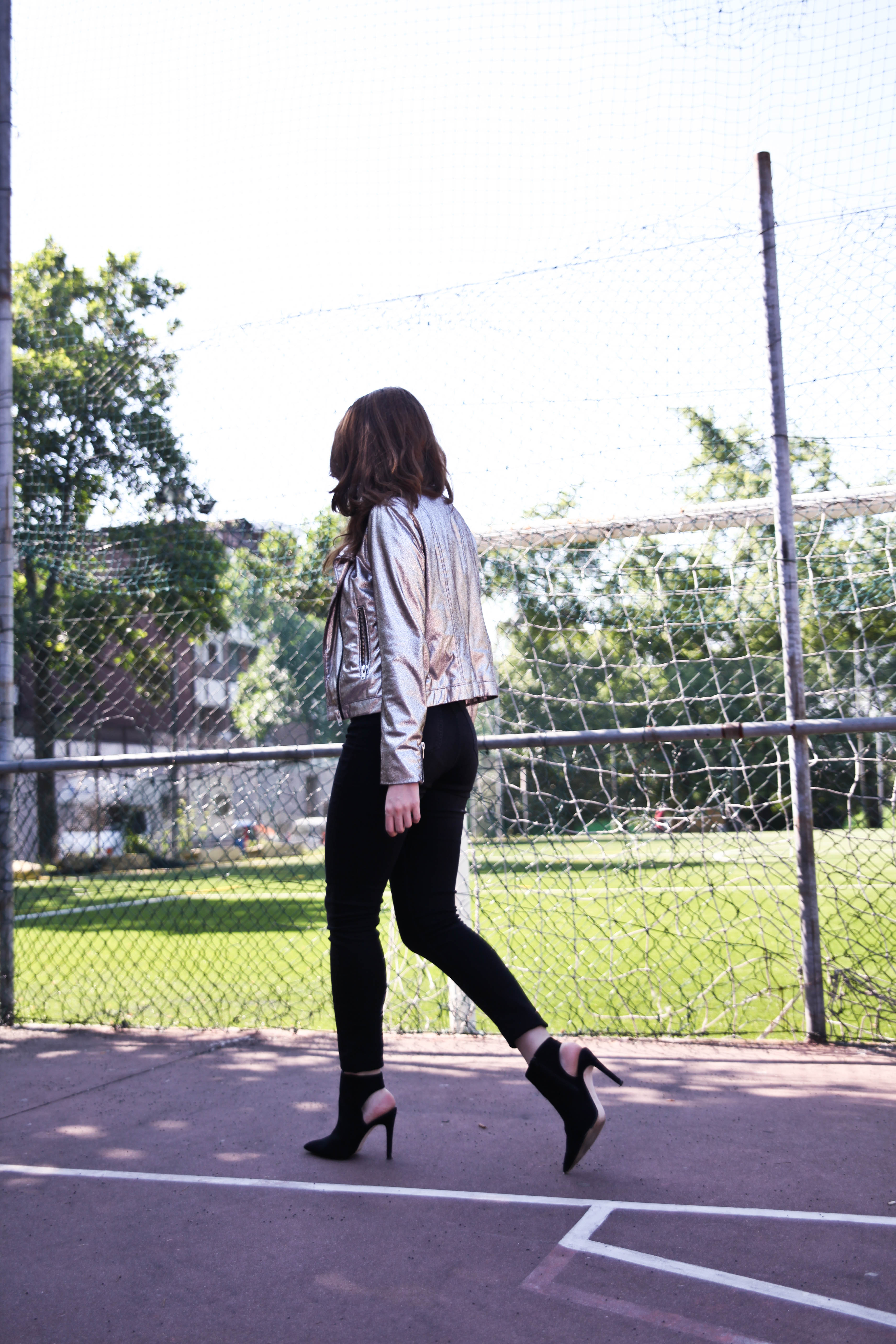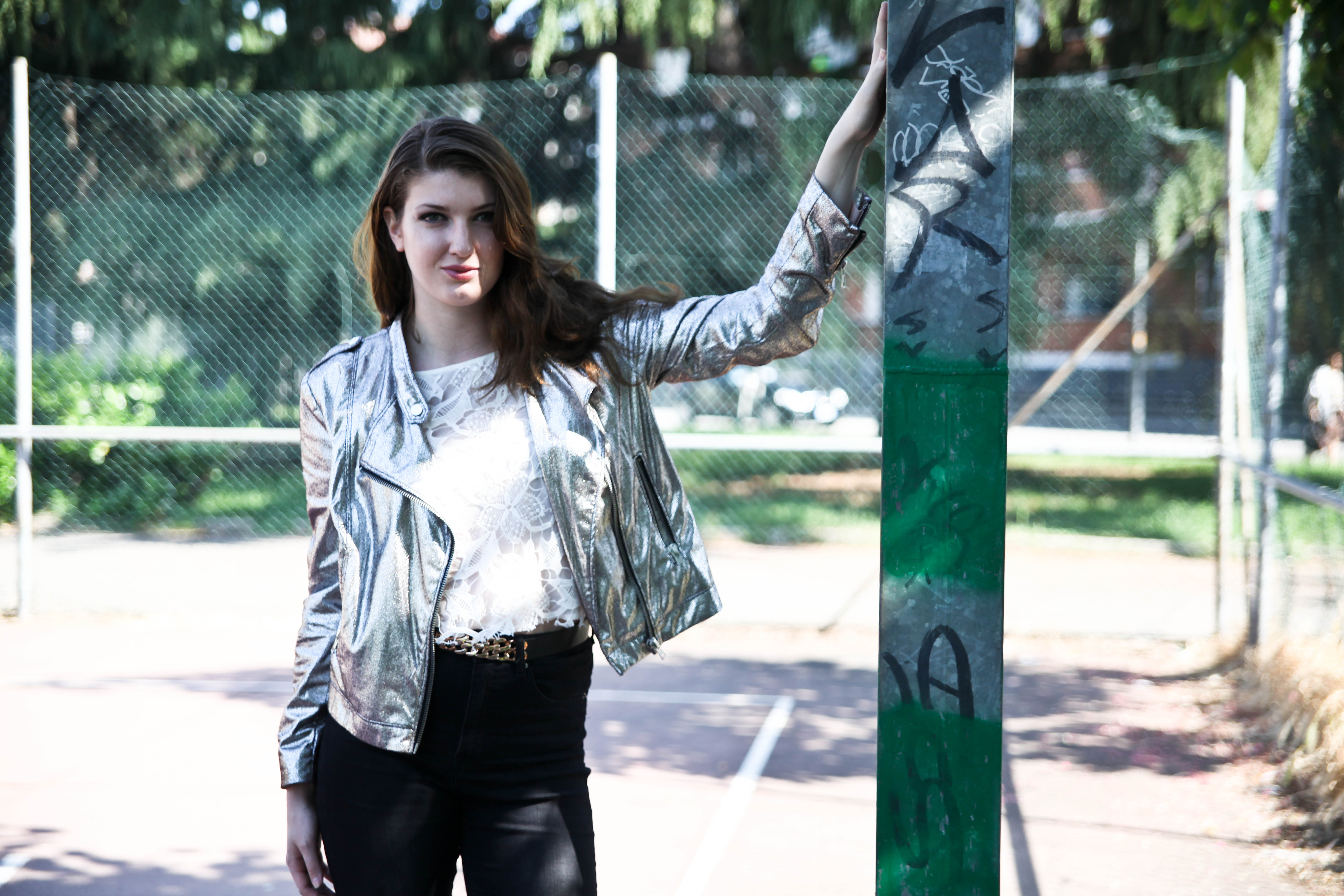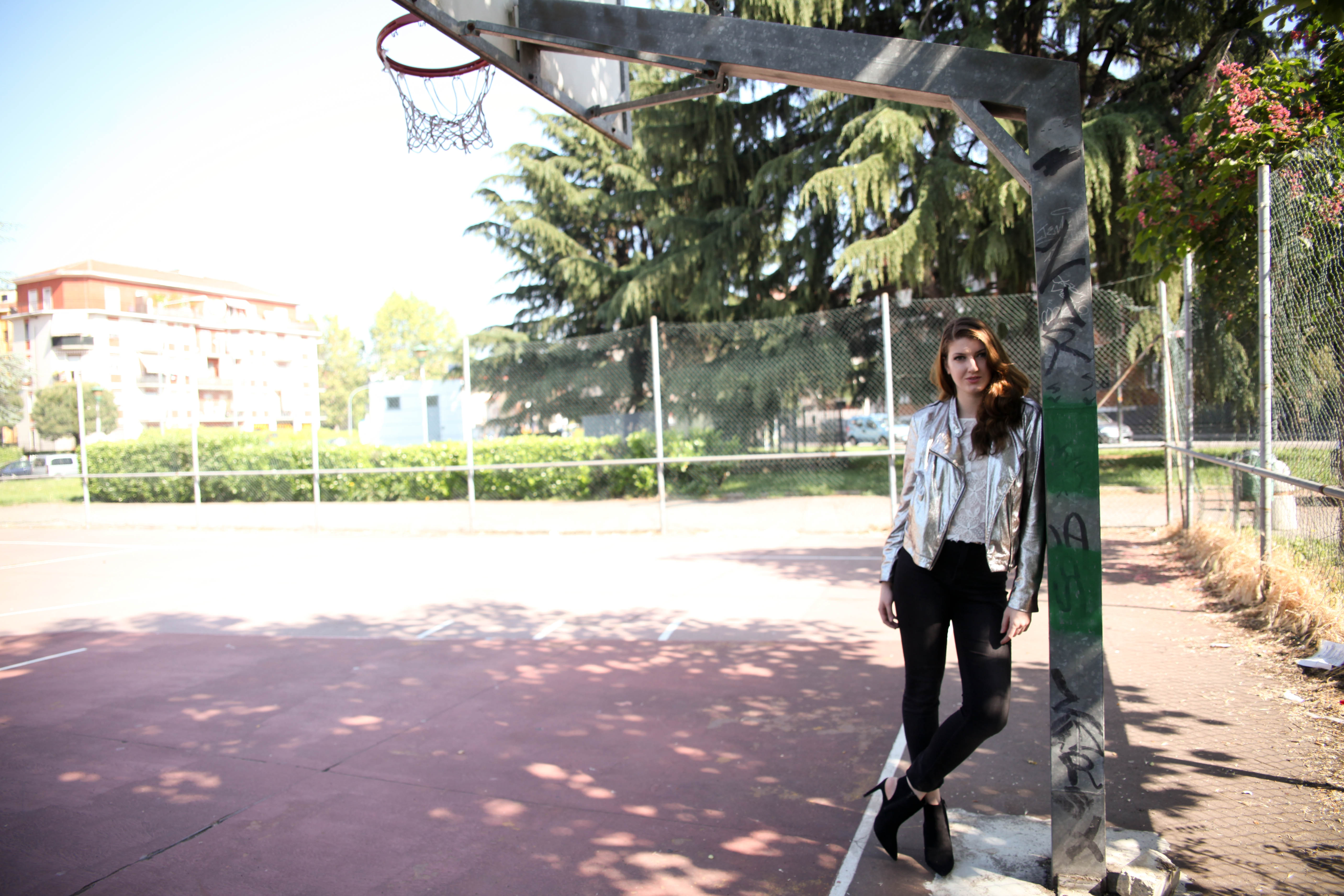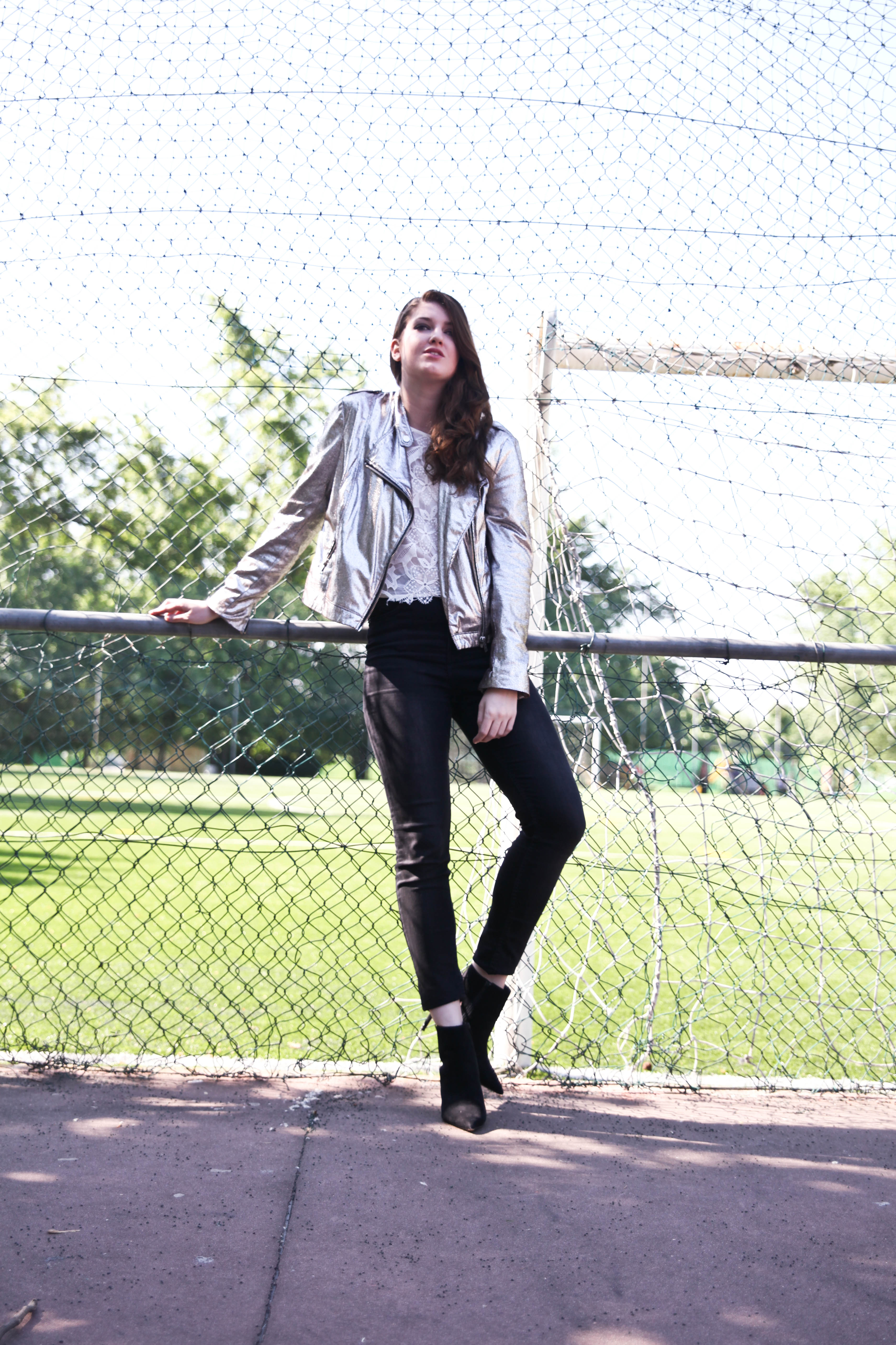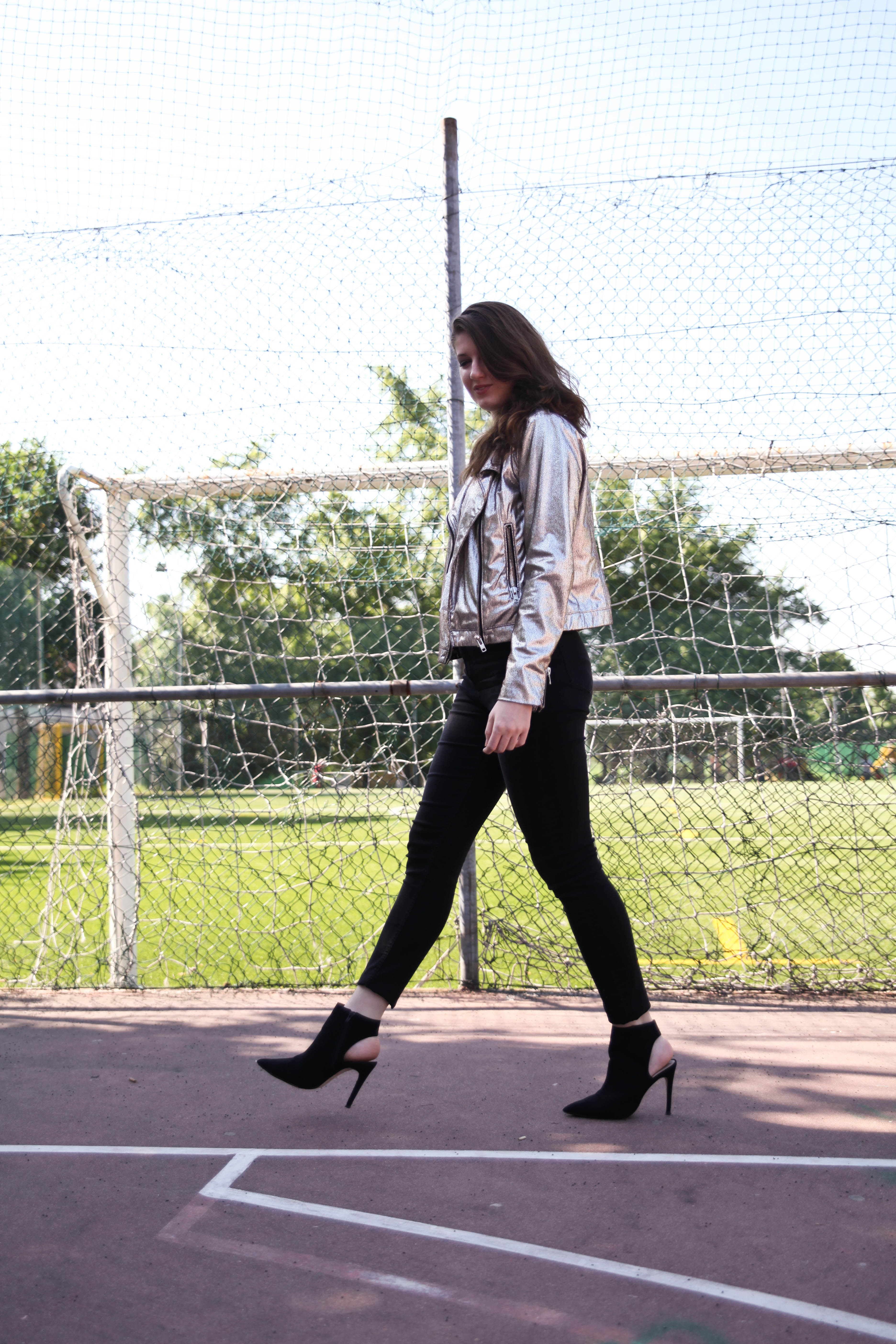 La mia proposta? Sicuramente per una serata all’insegna del divertimento ma non troppo formale. Un bel paio di tacchi, un crop top romantico che crea contrasto con un biker metalizzato.