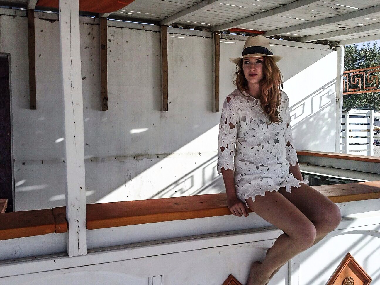 Un vecchio portico abbandonato e il mare davanti.